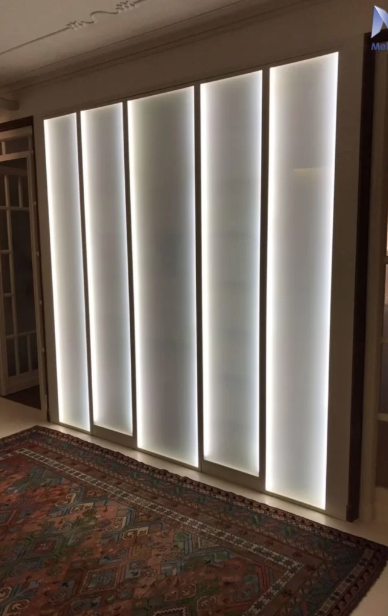 Stile esclusivo e moderno, una libreria che diventa all’ occorrenza una parete luminosa.