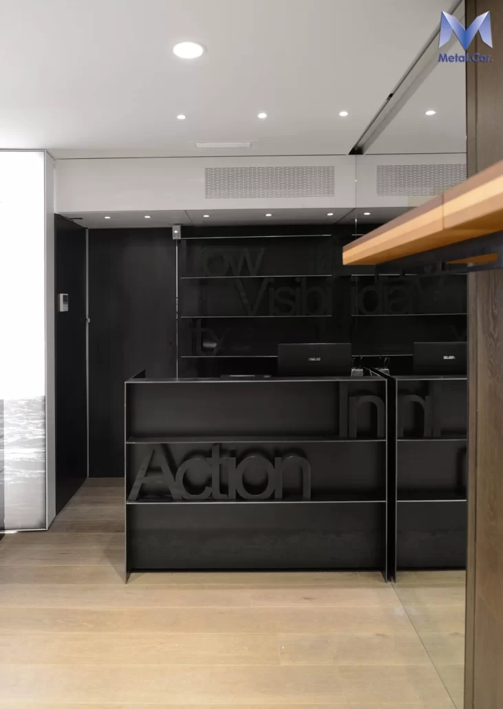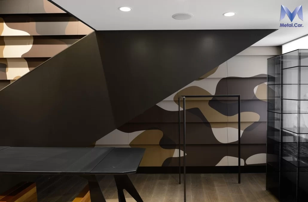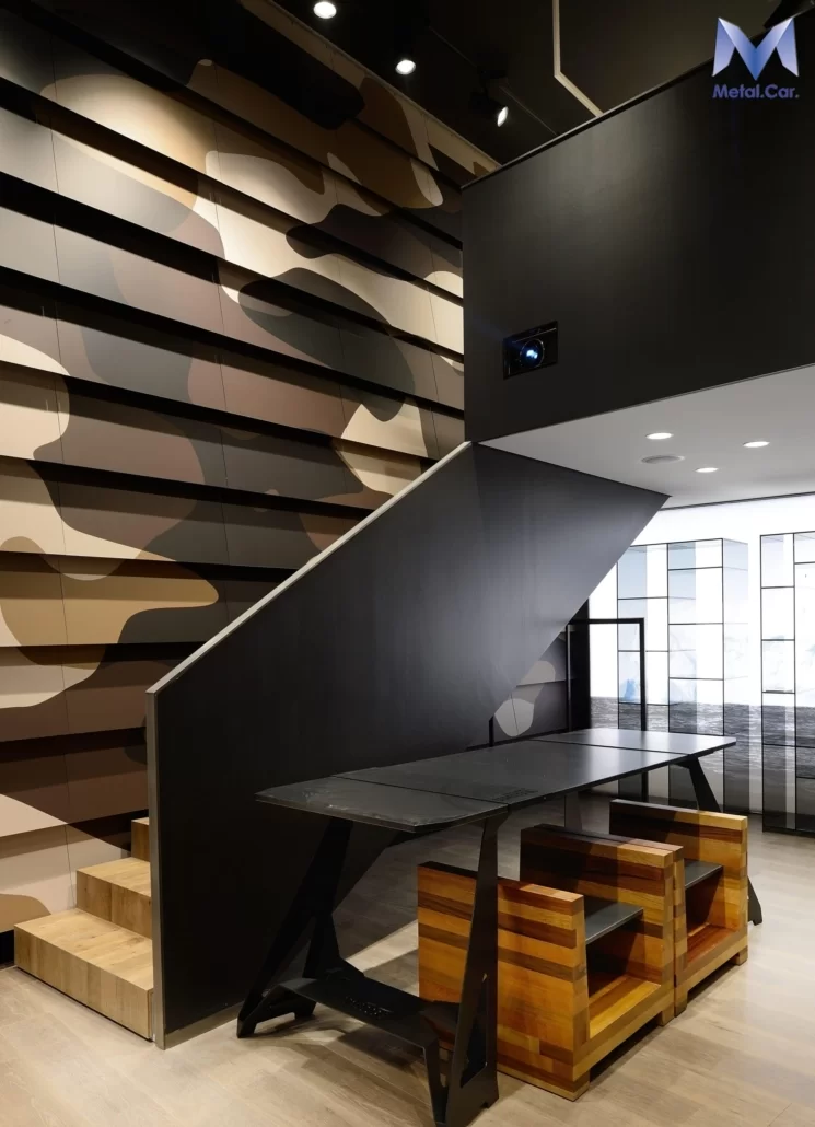 Metal. Car. ha preso parte a questo progetto, realizzando alcuni importanti componenti tra cui: tavolo, scaffalature, mensole, telaio interno della scala e parete metallica con pellicola effetto camouflage.
